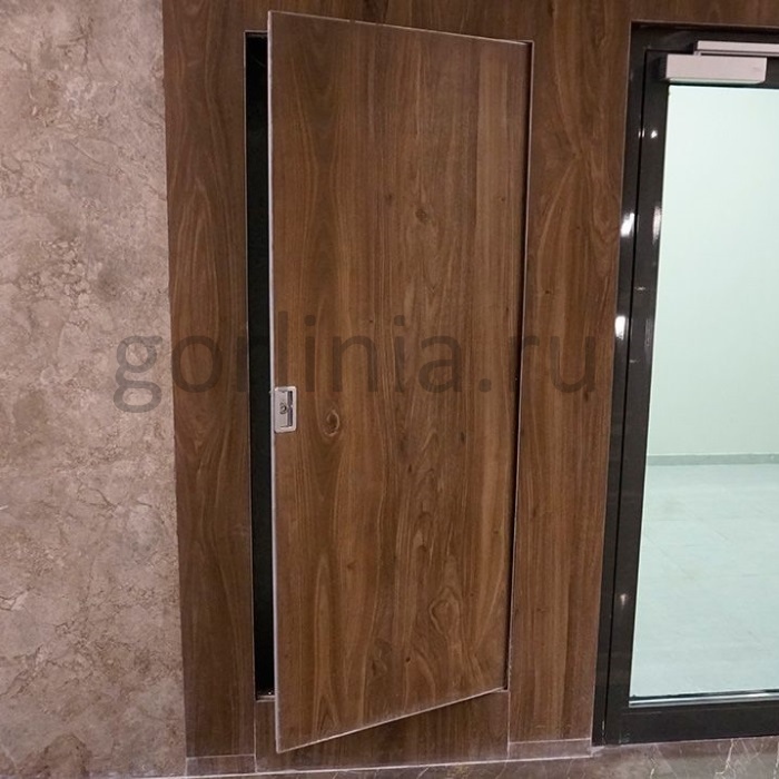 В скрытую коробку с порогом без наличника вклеена терморасширяющаяся лента, полотно на осевой подшипниковой петле заполнено минеральной плитой, закрытой листами ГВЛ и ГСП-DF.